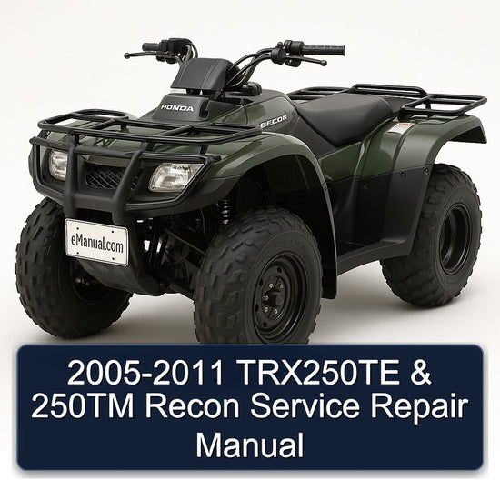 This manual covers the Honda TRX250TE and TRX250TM Recon models produced between 2005 and 2011. These ATVs are equipped with a 249cc liquid-cooled engine, featuring either a 5-speed automatic transmission...