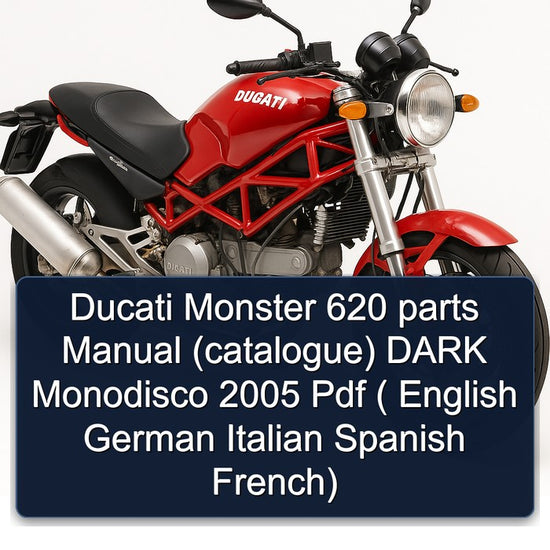 This manual covers the 2005 Ducati Monster 620 DARK Monodisco, a naked sportbike renowned for its minimalist, muscular design and distinctive Italian character. As an accessible entry into the iconic Monster line, this model features a 618cc L-twin engine with desmodromic valve actuation and a steel trellis frame, embodying Ducati's heritage of performance and style. Its engineering quality is evident in its handling dynamics and the characteristic L-twin engine, making it a popular choice for enthusiasts seeking a stylish and engaging riding experience. This comprehensive parts manual provides detailed illustrations and part numbers for all major systems, including engine components, fuel and ignition systems, transmission, chassis, suspension, braking, electrical systems, and bodywork. It is designed to assist owners, mechanics, and technicians in accurately identifying, ordering, and understanding the assembly of every part. The manual is available in English, German, Italian, Spanish, and French.