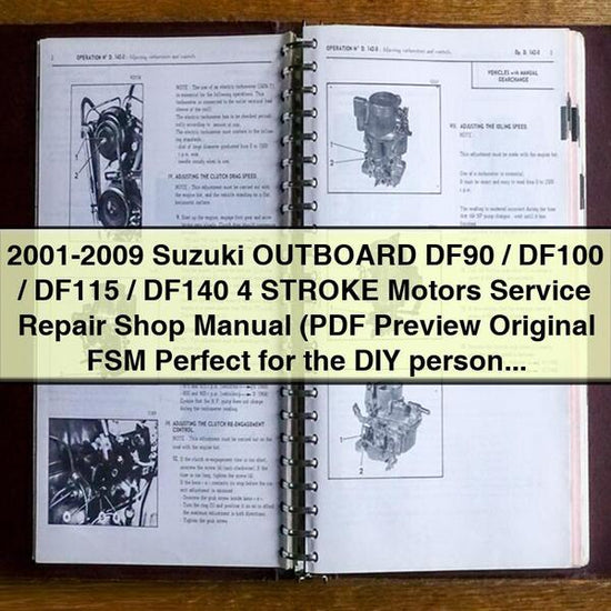 This factory service manual covers the Suzuki DF90, DF100, DF115, and DF140 outboard motors manufactured between 2001 and 2009. These 4-stroke gasoline engines offer a horsepower range from 90 to...