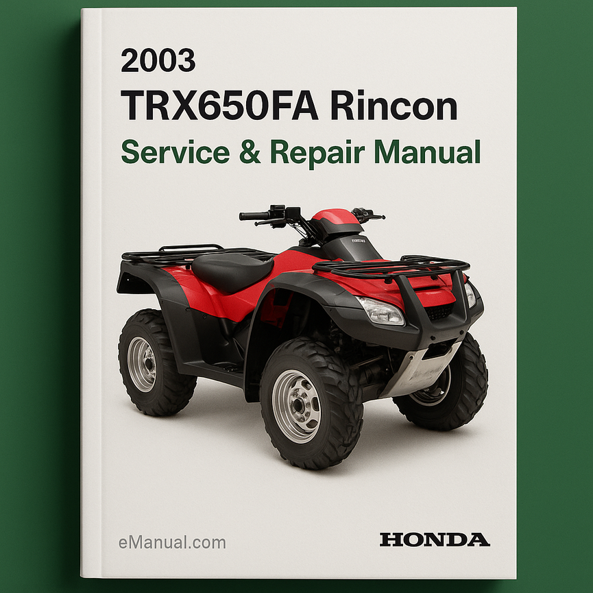 2003 TRX650FA Rincon Service Repair Manual🏷️ Basic Information Identification Make: Honda Model: TRX650FA Rincon Year: 2003 Vehicle Type: ATV (All-Terrain Vehicle) 👋 Introduction Market Position Target Audience: Professional mechanics, ATV technicians, and advanced DIY enthusiasts. Value Proposition Manual Utility: Provides the most complete service and...
