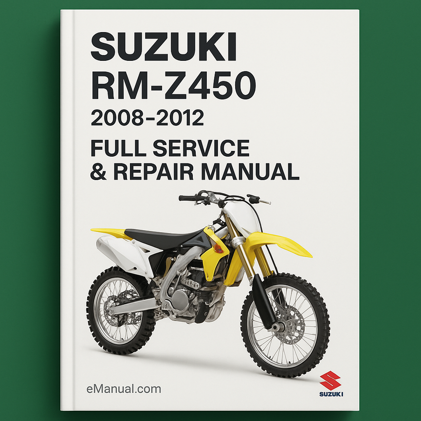Suzuki RM-Z450 RMZ450 Full Service & Repair Manual 2008-2012🏷️ Basic Information Identification Make: Suzuki Model: RM-Z450 Model Variant: RMZ450 Model Years Covered: 2008, 2009, 2010, 2011, 2012 Codes Platform Code: K8, K9, L0, L1, L2 👋 Introduction Market Position Vehicle Category: Motocross Competition Motorcycle Target Audience: Motocross racers,...