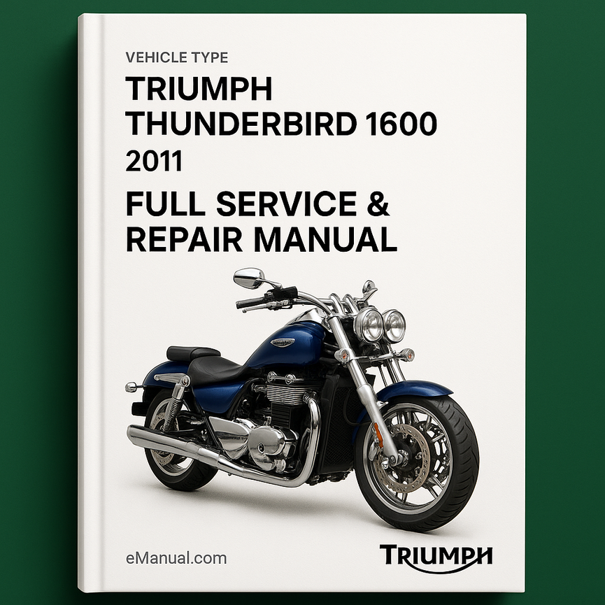 Triumph Thunderbird 1600 2011 Full Service Repair Manual🏷️ Basic Information Identification Make: Triumph Model: Thunderbird 1600 Year: 2011 Codes Engine Code: 1600cc Parallel-Twin (specific code not provided in source, but assumed to be a common designation for the 1600cc engine) Chassis Code: T300 (typical Triumph platform designation...